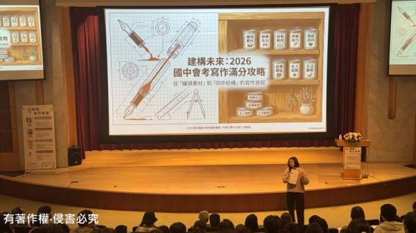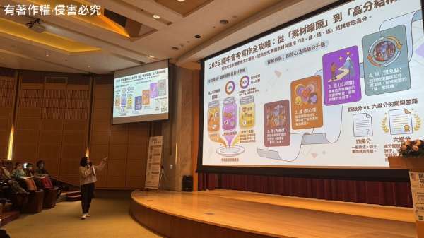 本會與臺中市立圖書館西屯及溪西分館共同舉辦「2026閱讀寫作教室系列講座」,特地將「會考作文前哨站」設為第一場次,柯惠馨老師帶來了【國中會考寫作全攻略】,幫助學生掌握到會考作文趨勢,透過預先準備素材與運用四步心法結構奪取高分。